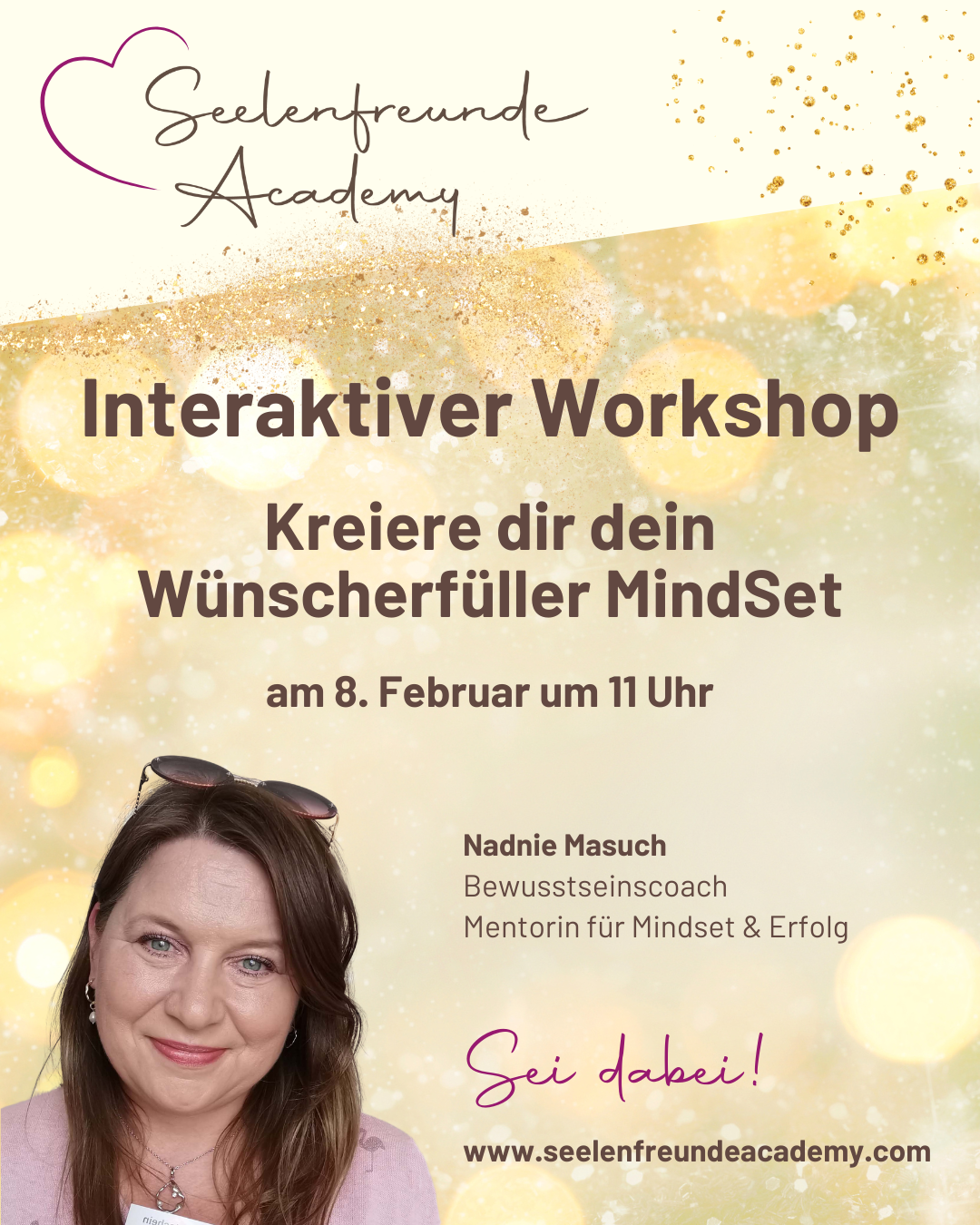 Im interaktiven Workshop „Kreiere dir dein Wünscherfüller-Mindset“ zeigt dir Nadine Masuch, wie du dein Denken so ausrichtest, dass Wünsche nicht länger Zufall bleiben, sondern bewusste Entscheidungen werden. Mit ihrer warmen, intuitiven und gleichzeitig klaren Art hilft sie dir, innere Blockaden zu erkennen, limitierende Gedanken zu lösen und ein Mindset zu entwickeln, das dich trägt. Dieser […]